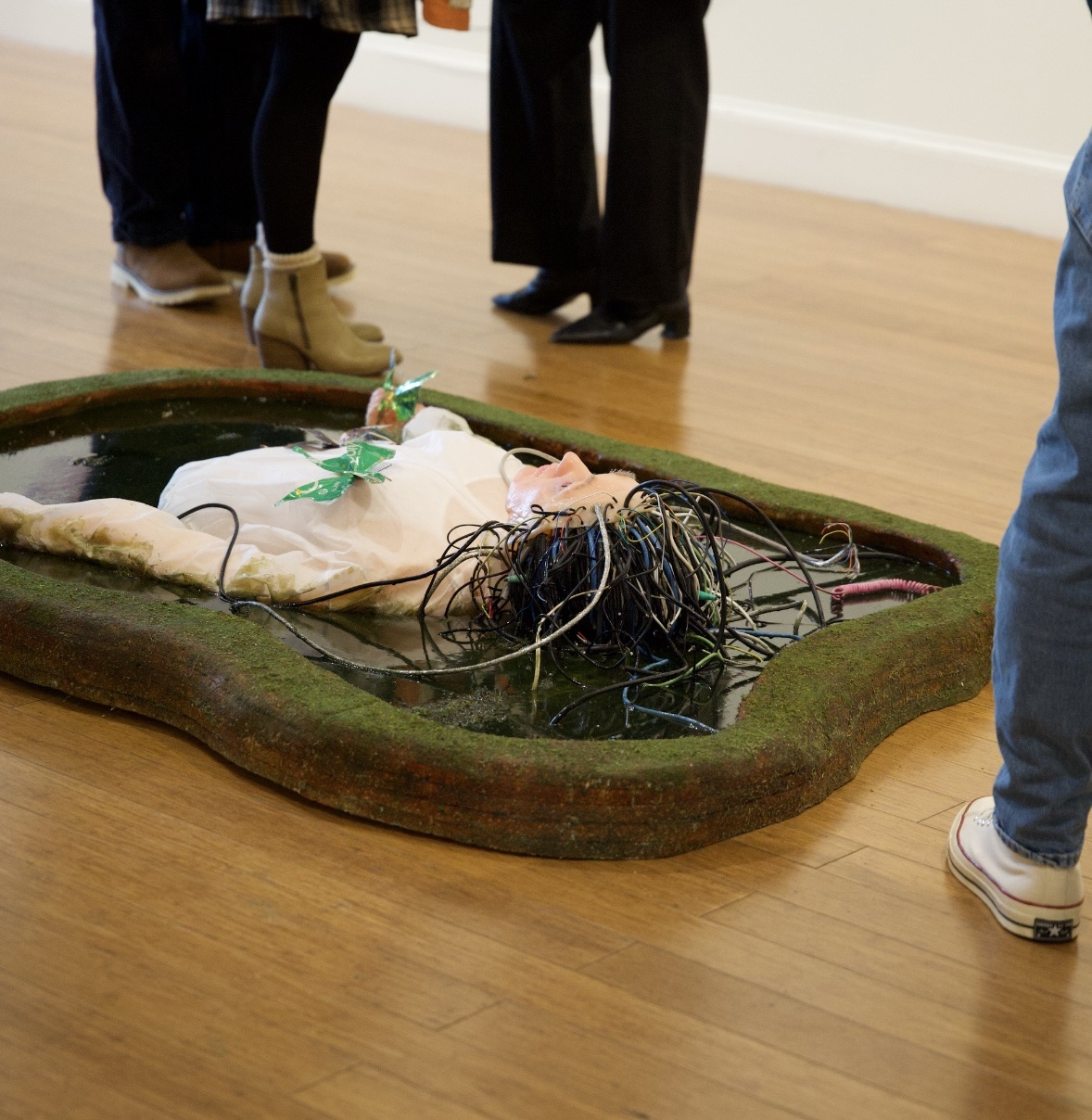 Oracle is a silicone life cast sculpture with displays embedded behind lenses in the eyes. I cast the silicone out of a mold, painted and colored it, made a foam armature for it to sit on, and installed the XIAO round displays attached to XIAO ESP32-C3s attached to power banks for portability.